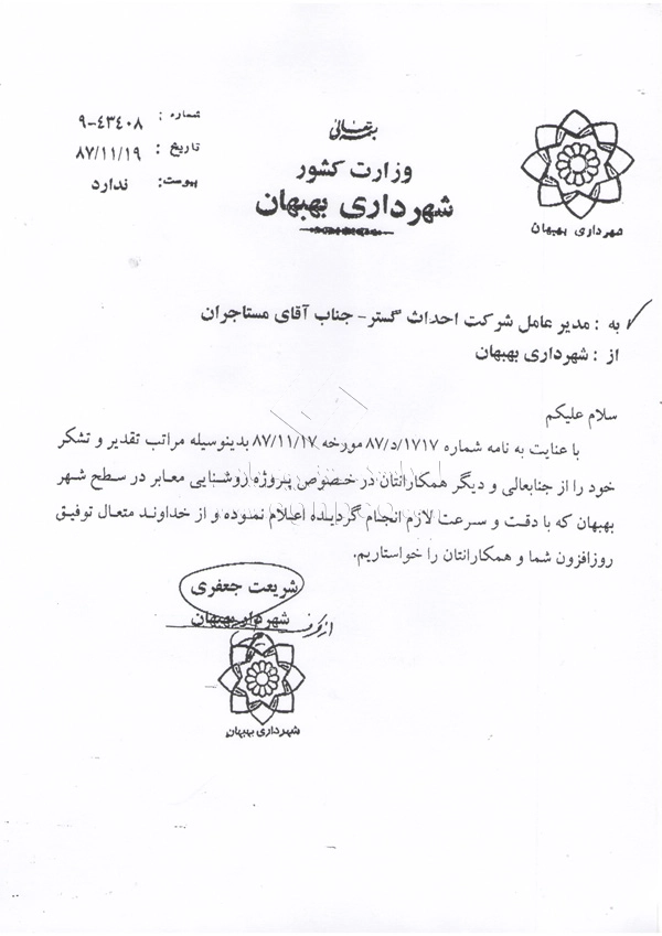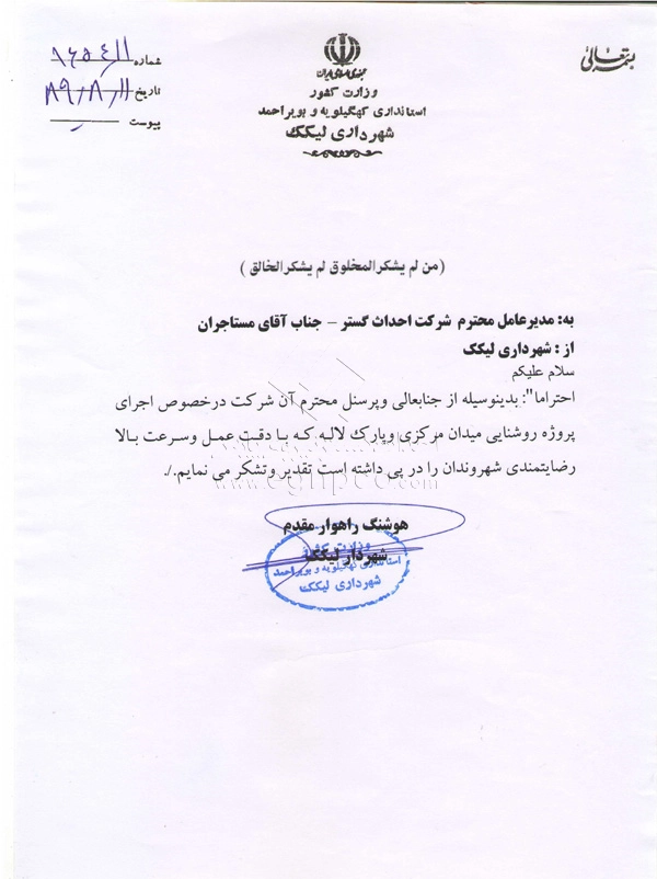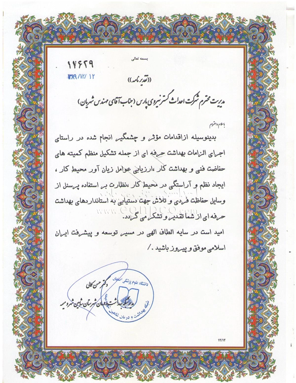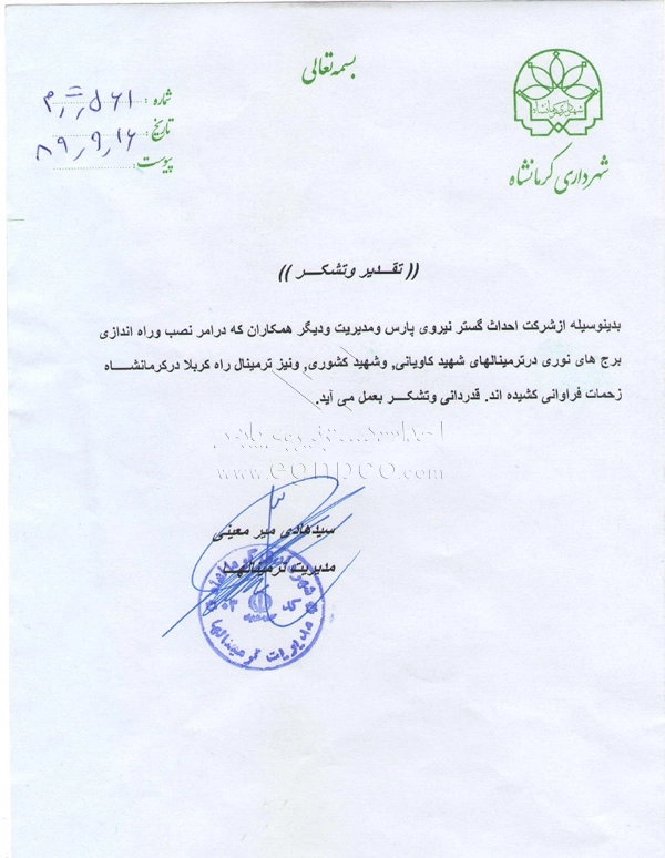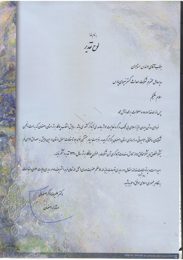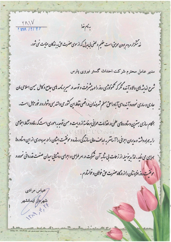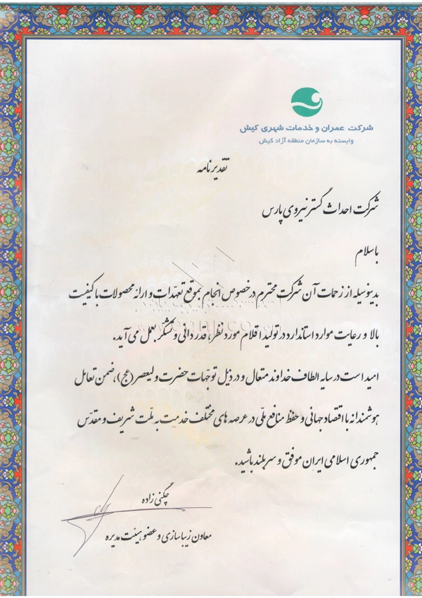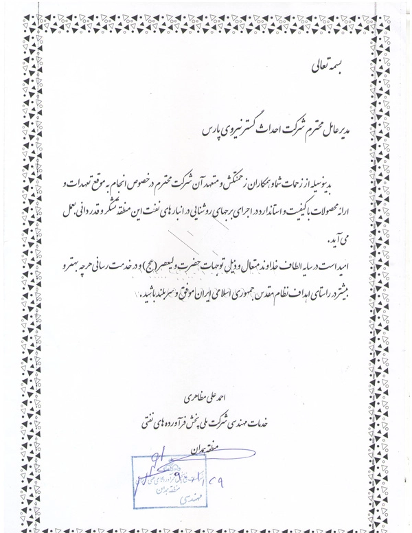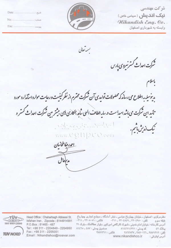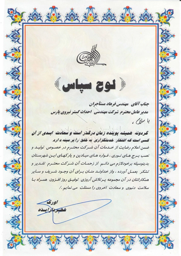 Modern progress and development are increasingly driven by collaborative efforts between companies and organizations. In this regard, Ehdas Gostar Nirooye Pars Engineering Company has been able to gain the following approvals through presenting its products and services according to its management policy of gaining customer’s trust and satisfaction (design, construction, and installation of street and park lighting poles, light towers, stadium towers, flag towers, traffic poles, and other products) with utmost accuracy and quality:
