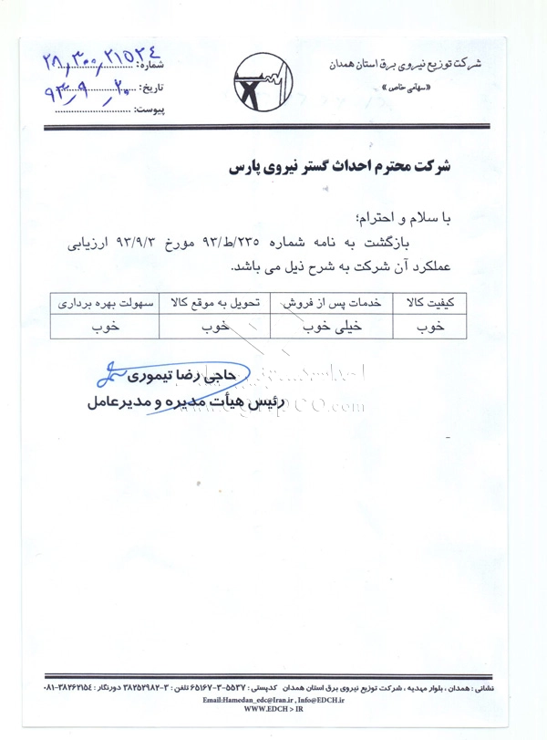 List of manufacturers of most electricity distribution companies (Tehran, Isfahan, Khuzestan, Markazi, Lorestan, Qazvin, Ardabil, Fars, Shiraz, Hamedan, North and South Kerman, etc.)